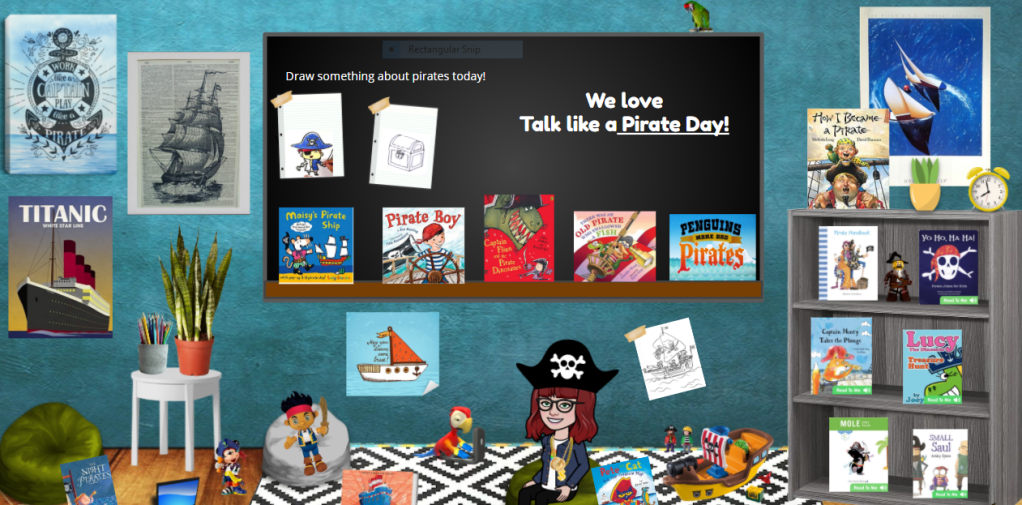 Click on the pirate themed Bimoji classroom to celebrate TLAP Day with me! There are reading, drawing and craft opportunities aboard. It’s my favorite fall holiday ever! The great thing about this nonsense holiday is that it gives kids and adults something funny to connect with at the beginning of the school year. How can you not have an amazing day at school when your teacher is wearing pirate gear and calling you a scurvy dog when you don’t do yer work?