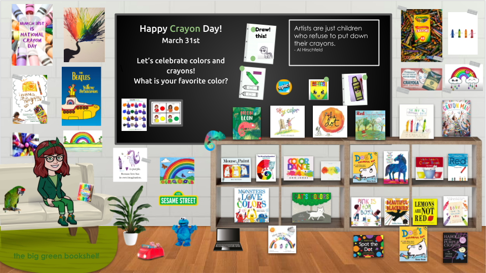 In celebration of crayons and coloring (two much appreciated pillars of childhood) I curated a library of read alouds, videos of making crayons, drawing instructions, and more. My favorite part will be students using google drawing to create and name their own custom crayon color. You can see my custom color inventions using google drawing at left. I love all shades of green- but love hearing the names kids come up with for new colors almost as much! This blog would be fun to share, too, it has the list of all current crayon colors, might inspire the name selection. Happy creating! To make a copy of the library below, click the image and go to file- make a copy.