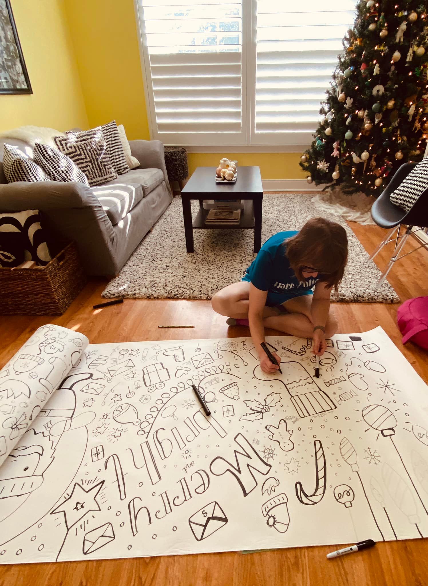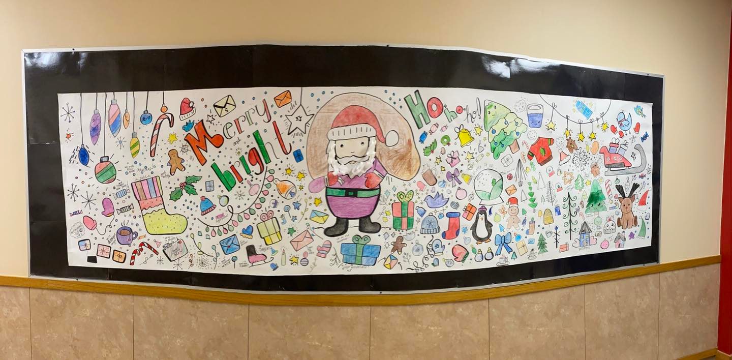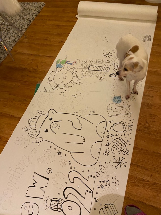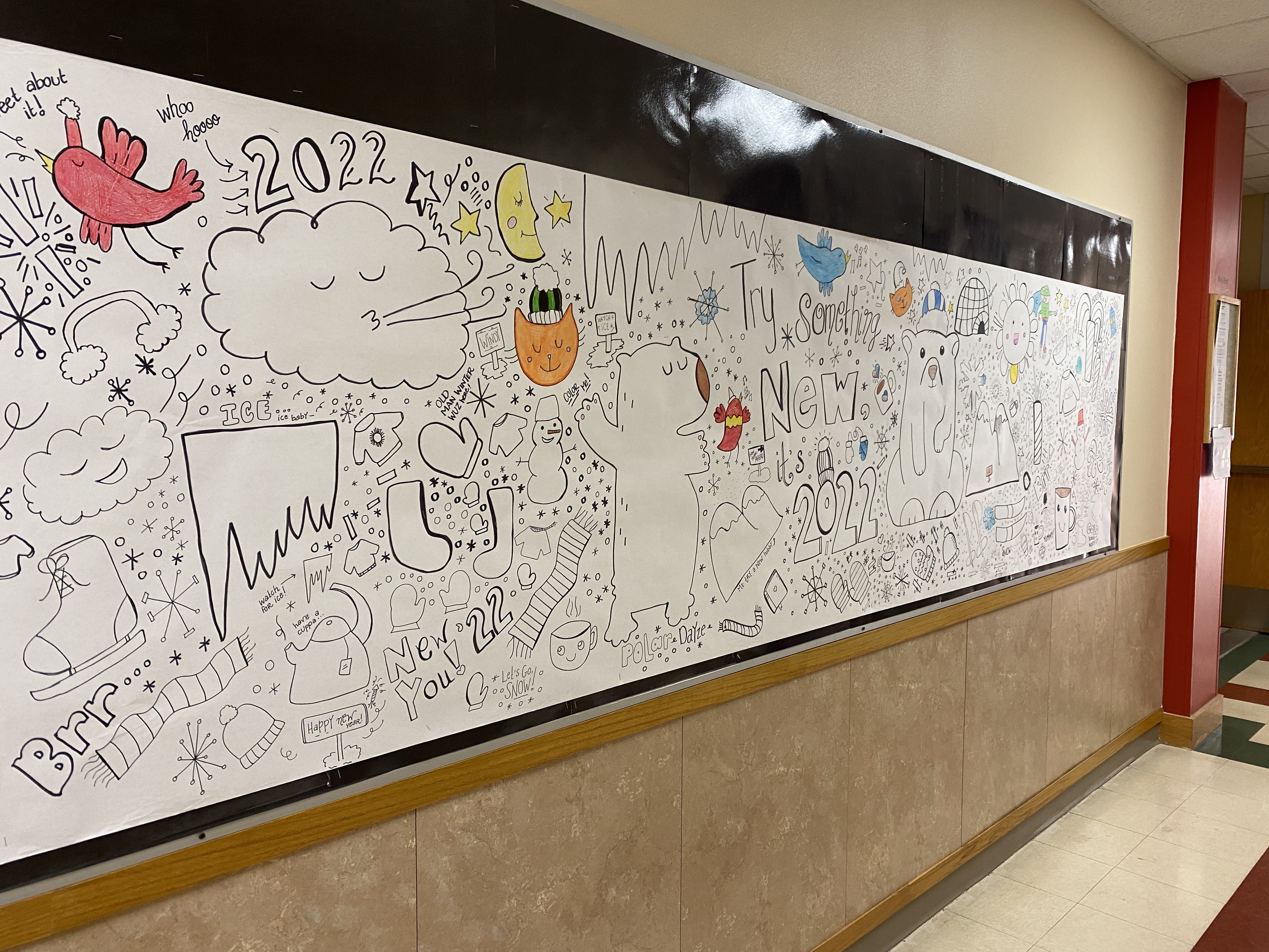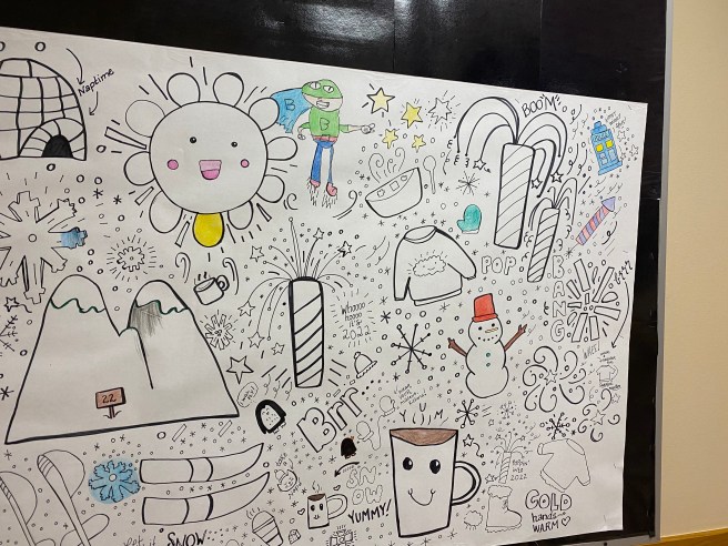 After the popularity of a coloring mural for the winter holidays, I decided a fresh start for the new year would be a fun thing to try. I depend upon snowflakes and polar bears to kick off the new year with a fun attitude instead of moping over all of the missing Christmas decorations. ( I was referring to my moping, not necessarily the kids’) I had just a small control issues moment when someone colored the bear in multi hues and scribbled a bit. How did I fix it? I added ear muffs and a scarf. And I feel better about the whole thing. I mean pretty much, other than I thought he would be a polar bear a bit longer. We color in the morning just before class or as a break at recess. Many studies are out there supporting a coloring break for kids and adults! Take one soon.